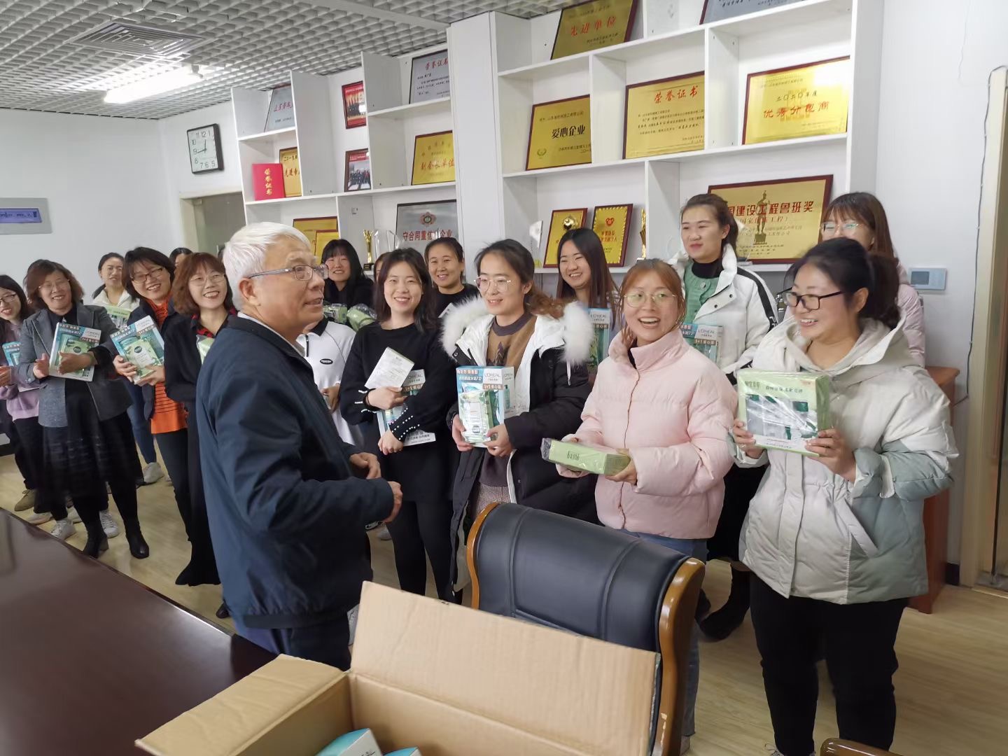 公司周總親自為女職工們分發(fā)節(jié)日禮物,