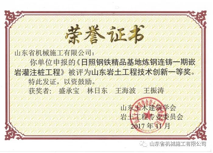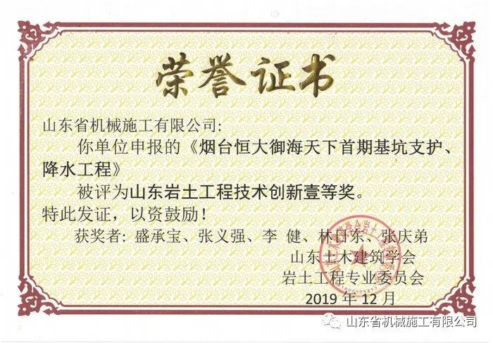 多年的堅(jiān)持和努力,盛承寶也收獲累累,其任項(xiàng)目經(jīng)理期間所承建的工程多次榮獲《山東巖土工程技術(shù)創(chuàng)新壹等獎(jiǎng)》,個(gè)人屢次被評(píng)為山東機(jī)施優(yōu)秀項(xiàng)目經(jīng)理。還通過(guò)了高級(jí)工程師評(píng)審及建造師考試,更令他感到光榮的是2021年被推薦成為中國(guó)共產(chǎn)黨入黨積極分子。