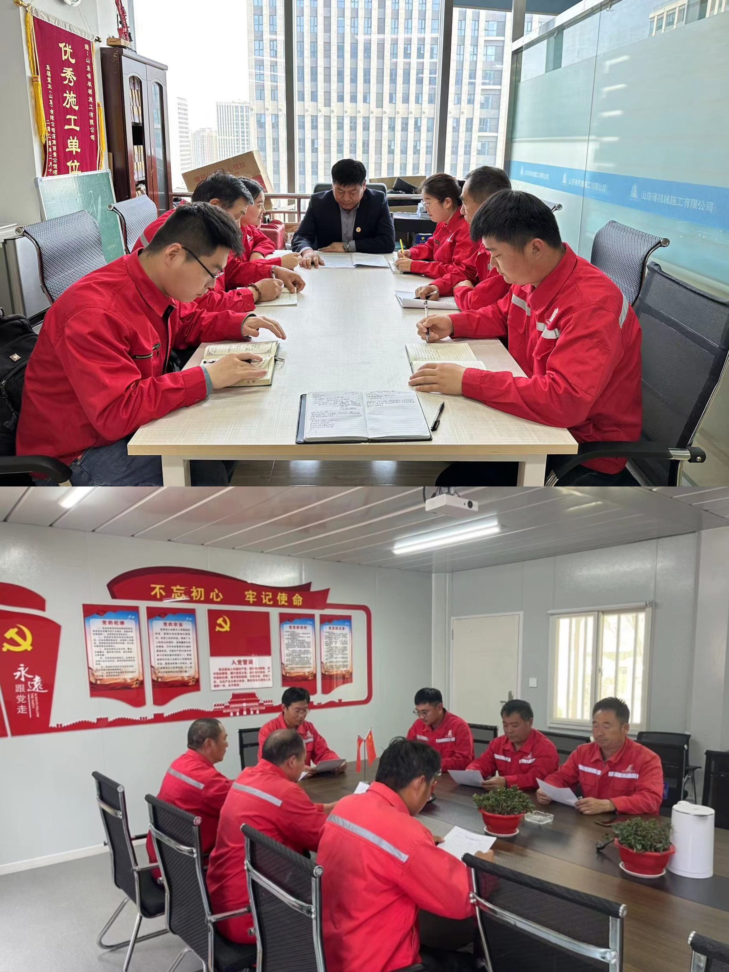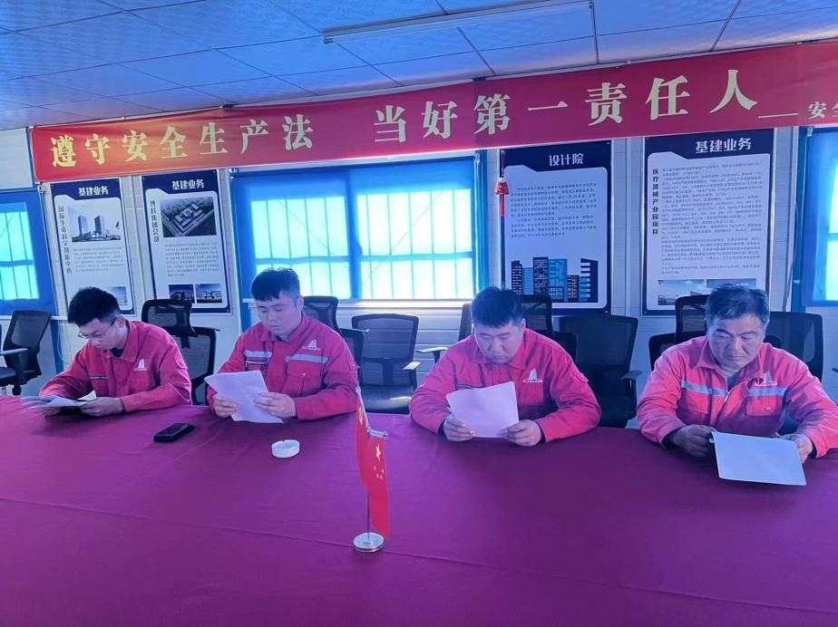 巖土分公司青島上合廣場指揮部學(xué)習(xí)傳達(dá)生產(chǎn)會精神。