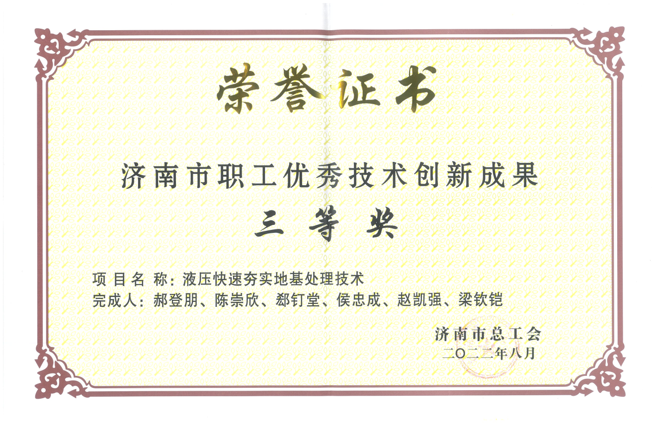 近日,山東省機械施工有限公司的創(chuàng)新技術《液壓快速夯實地基處理技術》被濟南市總工會直屬工會推薦為“全省職工優(yōu)秀創(chuàng)新成果入庫孵化轉化集中行動”入庫項目。